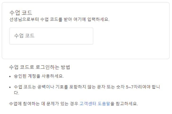 학생은 선생님이 개설한 수업에 참여하기 위해서 '수업 코드'를 전달받아야 합니다. 이후 아래 과정을 따라 진행해 주세요.