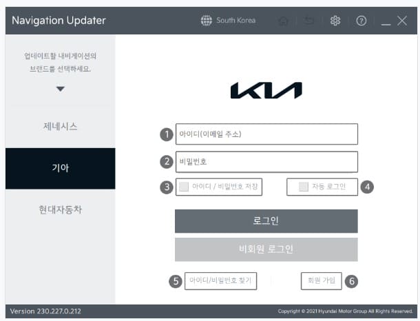 상단의 내비게이션 업데이트 파일을 다운로드하고 설치를 완료했다면 기아자동차 계정으로 로그인을 진행해야 합니다.