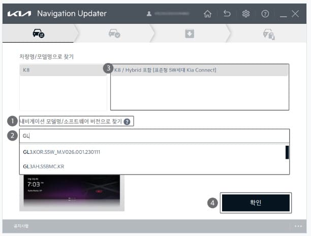 나의 차량 모델을 선택하면 해당 차량에 맞는 내비게이션 업데이트 파일을 다운로드할 수 있습니다. [차량명/모델명으로 찾기]에서 나의 차량과 모델을 선택하고 확인 버튼을 클릭합니다.