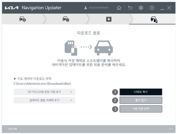 저장장치를 PC에 연결한 상태에서 [USB로 복사] 또는 [SD카드로 복사]를 클릭하면 저장장치로 내비게이션 업데이트 파일이 이동합니다.