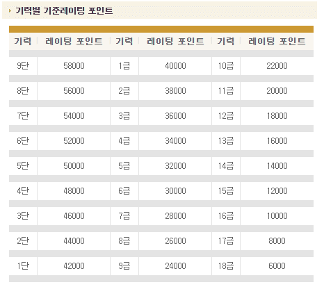 기력별로 기준 레이팅 점수가 존재합니다. 이것은 실력이 비슷한 유저가 게임을 즐기기 위한 기준입니다. 아래 표와 같이 레이팅 포인트에 따라 기력(단, 급)이 정해지니 참고해 주세요.