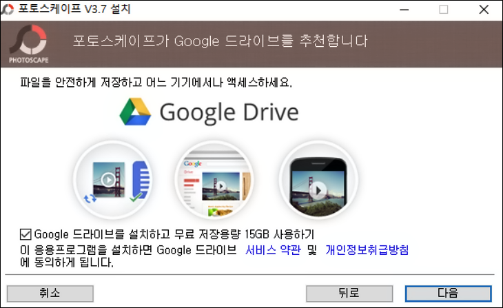 ▼포토스케이프가 무료 프로그램이라는 것을 안내하고 있습니다. 설치 버튼을 눌러 다음단계로 이동할 수 있습니다. ▼구글 드라이브 설치여부를 확인합니다. 사용을 원하지 않는다면 체크를 제거하고 다음 버튼을 눌러주세요. ▼포토스케이프 설치가 진행됩니다. ▼포토스케이프 설치가 완료되었습니다. 마침 버튼을 누르면 포토스케이프가 실행됩니다.