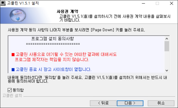 ▼고클린 설치 동의사항으로 고클린 종료 시 광고창이 열리는 것을 안내하고 있습니다. 동의함에 체크하고 다음버튼을 눌러주세요.