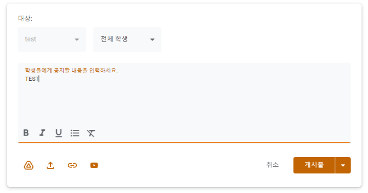 수업 메인 화면에서 학생들에게 공지할 내용을 작성할 수 있습니다. 전체 학생 및 특정 학생을 지정하여 선택적으로 공지할 수 있습니다.