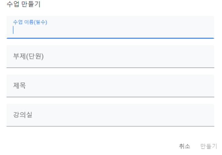 ▼우측 상단에 수업 만들기 클릭 후 수업 이름과 부제, 제목, 강의실 정보를 입력합니다.