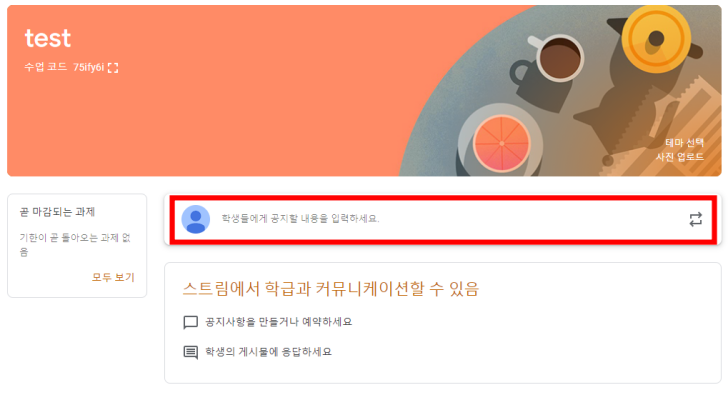 빈칸 작성 후 '만들기'를 클릭하면 생성된 클래스를 확인할 수 있으며 좌측 상단에 수업 코드를 학생들에게 공유합니다.